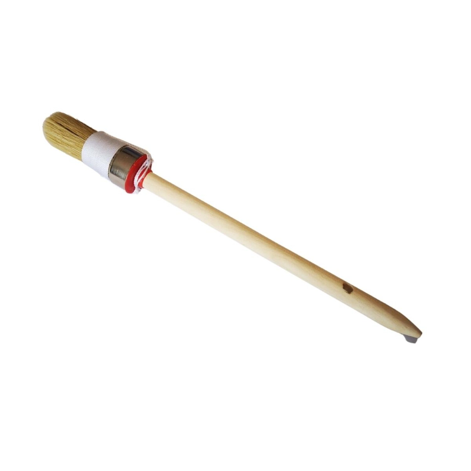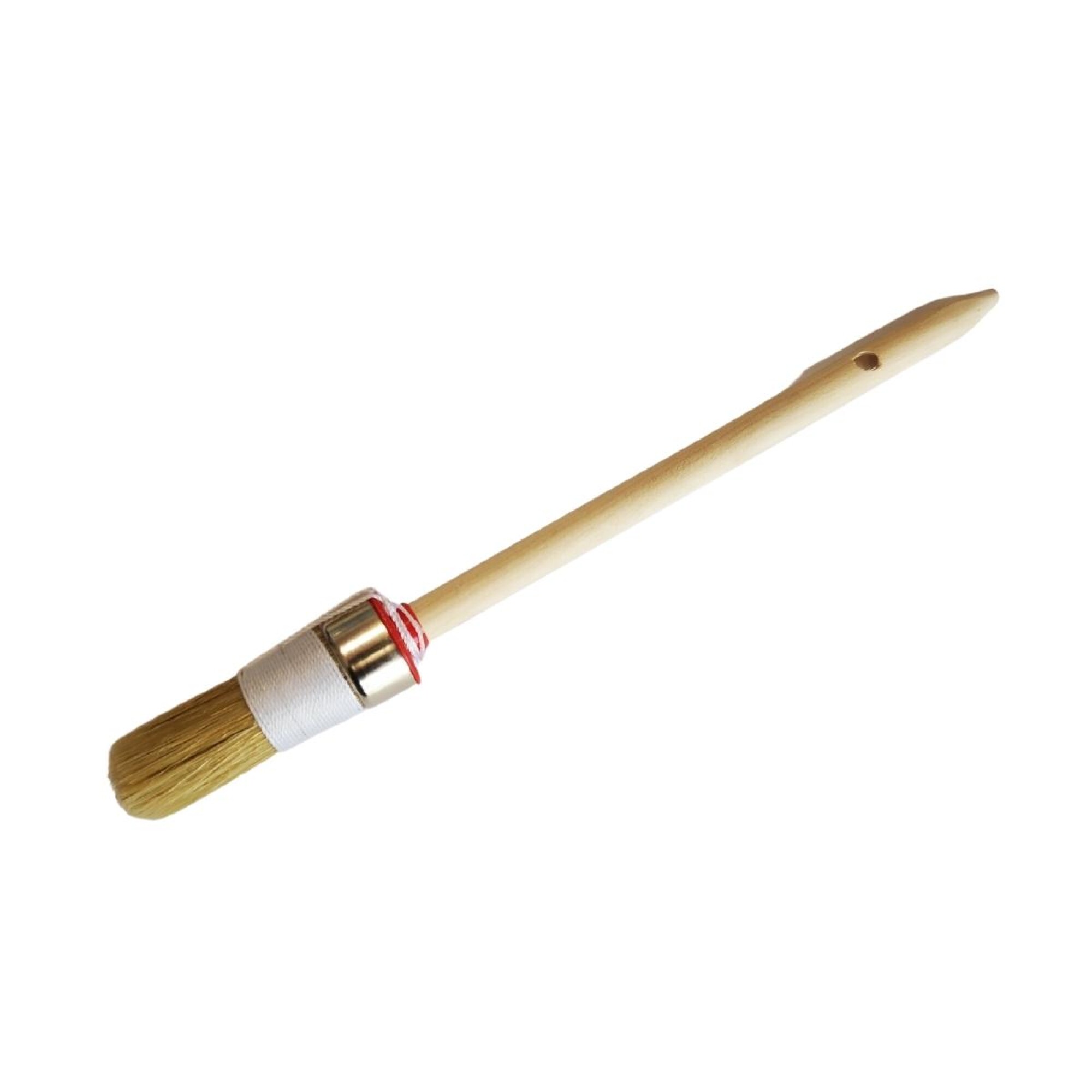 Brocha redonda prensada, de cerda blanca, virola de aluminio y mango de madera barnizadp. Apta para uso con pinturas plásticas, esmaltes,lacas, barnices, etc. La cinta de hilo se puede acortar para obtener siempre la misma longitud visible de las cerdas con el desgaste posterior. Características: - Para recortar y retocar en rincones, aristas, marcos, molduras, etc - Especial para superficies redondeadas - Para pintar con la mejor herramienta