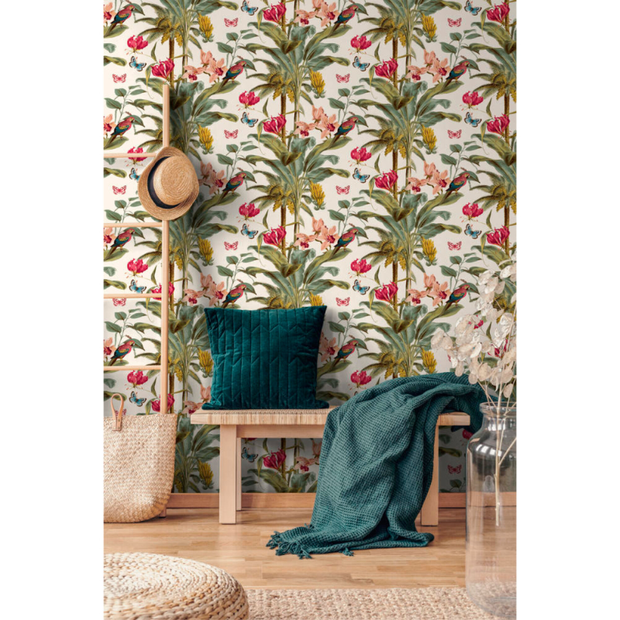 El papel tapiz de hoja de plátano lleva la jungla a tu hogar. Jungle hasta el final con papel tapiz que une plátanos y mariposas en un alegre diseño de jungla. Las hojas de plátano y los detalles de colores vivos hacen que este papel pintado de vinilo sea imprescindible para el diseño de interiores. - Material no tejido - Lavable - Medidas: 52 cm de ancho x 10 mts de largo * Sin cambio ni devolución