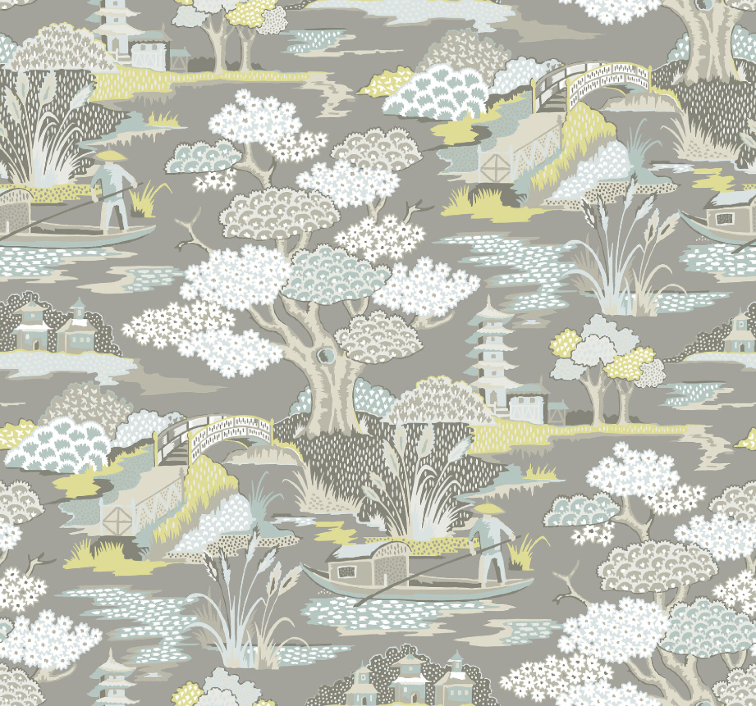 Lleno de puentes, pagodas y barcos de pesca, este diseño de baño representa un paisaje exuberante. Su elegante patrón gris está acentuado por toques de tonos amarillos y celestes. Joy De Vie es un papel pintado no tejido sin pegar. - Material no tejido - Partido recto - Lavable - Instalación Pegar la pared - Medidas: 52 cm de ancho x 10 mts de largo * Sin cambio ni devolución