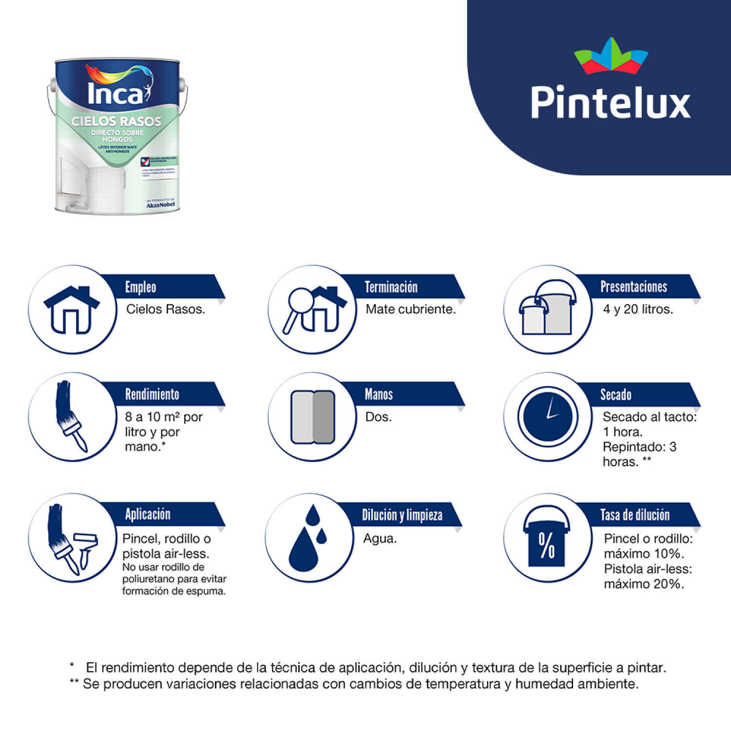 Pintura para cielos rasos interiores mate. Sin productos previos-se aplica directo sobre hongos. Previene el crecimiento de hongos y evita la condensación de humedad. Se puede entonar con Incatone hasta 30cm³ por litro. Se aplica con pincel, pistola air-less o rodillo de corderito. No usar rodillo de poliuretano para evitar la formación de espuma. Rendimiento: 10m2/lt. Características: - Antihongos - Alto poder cubritivo - Alta performance - Película de pintura permeable a los vapores