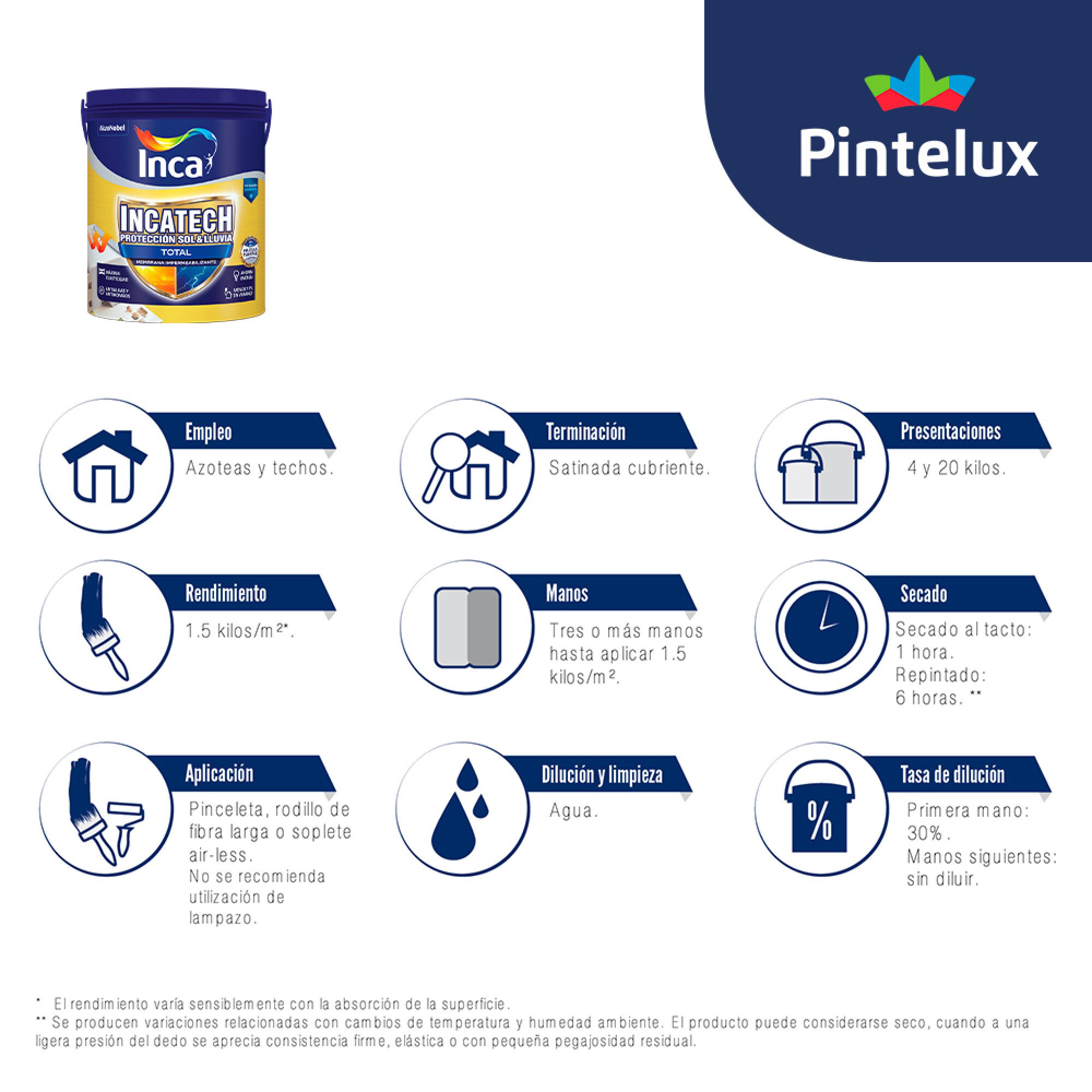 Membrana impermeabilizante de alto desempeño para techos y azoteas. Máxima elasticidad e impermeabilidad. Especialmente formulada con micro-esferas termoaislantes de Expancel® que reducen la temperatura de las superficies donde se aplica, disminuyendo la transferencia del calor desde el exterior y mejorando la aislación térmica. Sella fisuras o grietas. Se aplica con pinceleta, rodillo de fibra larga o soplete air-less. No se recomienda utilización de lampazo. Características: - Impermeabilidad reforzada - Resistente a los agentes climáticos - Protección prolongada - Máxima elasticidad - Sella fisuras - Antialgas