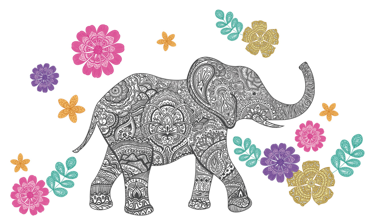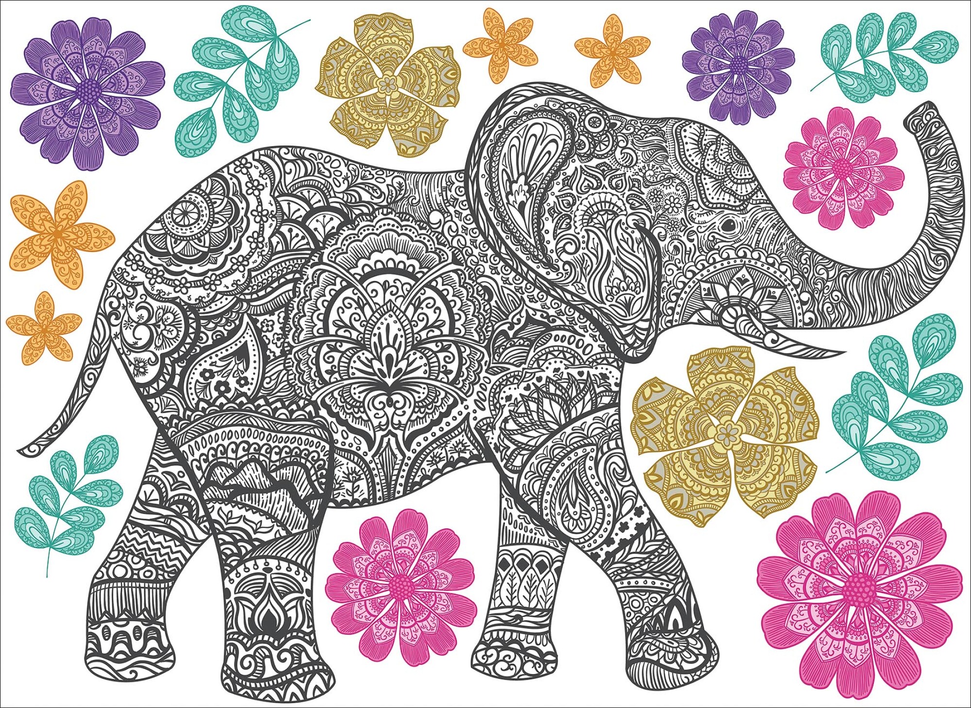 Diseño de mehndi intrincado, este kit de arte de pared global-chic es realmente impresionante. Una mezcla de flores y hojas rodea a un elegante elefante, todo diseñado en hermosos tonos de joya. Características: - Pelar y pegar - Reposicionable, y siempre extraíble - Seguro para paredes - Ningún residuo pegajoso - Rapido y Facil *sin cambio ni devolución