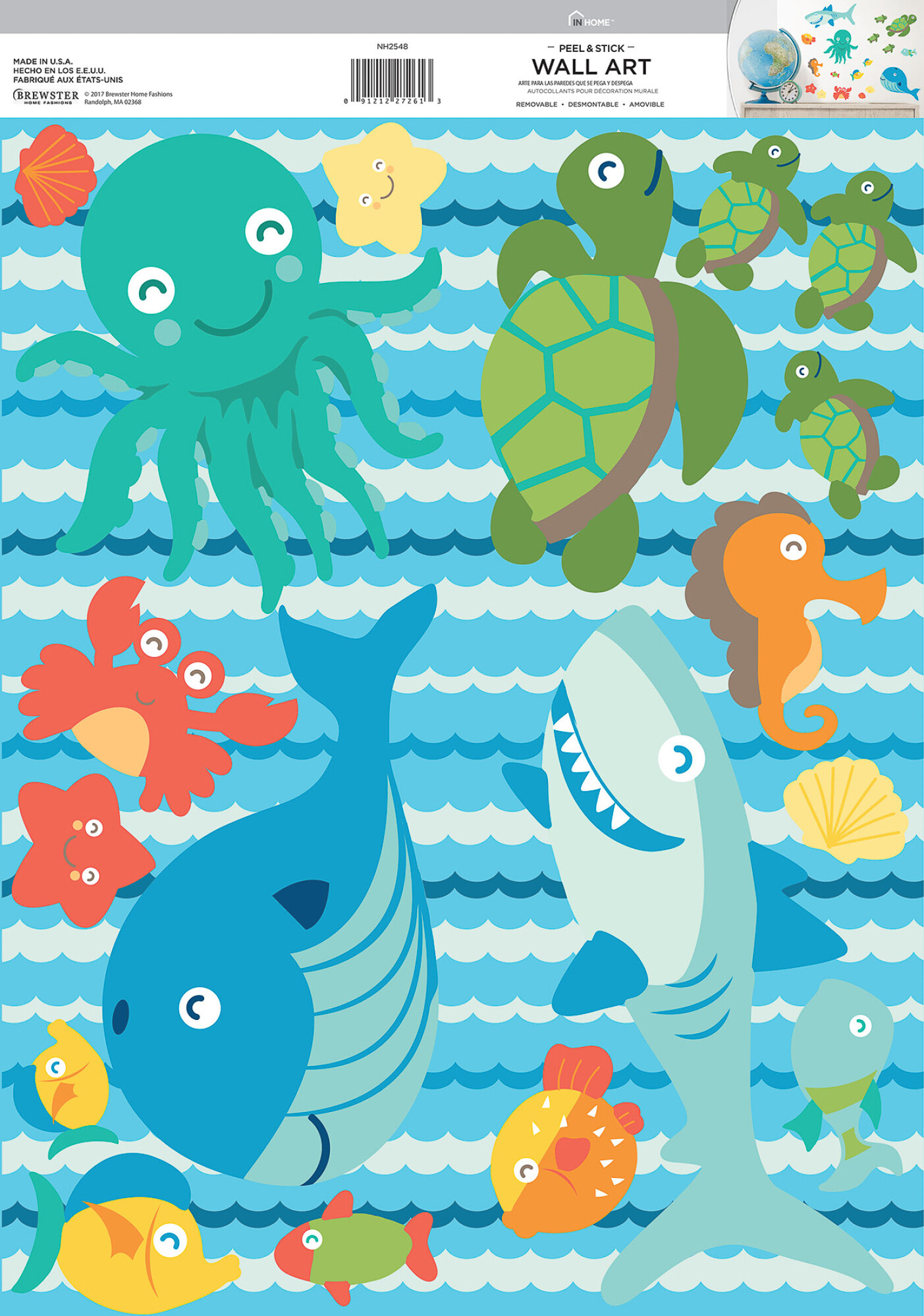 Ideal para agregar color a un baño o habitación con tema bajo el agua. Esta hoja de calcas presenta una variedad de criaturas marinas felices. Características: - Pelar y pegar - Reposicionable, y siempre extraíble - Seguro para paredes - Ningún residuo pegajoso - Rápido y Fácil - Contiene 18 piezas *sin cambio ni devolución